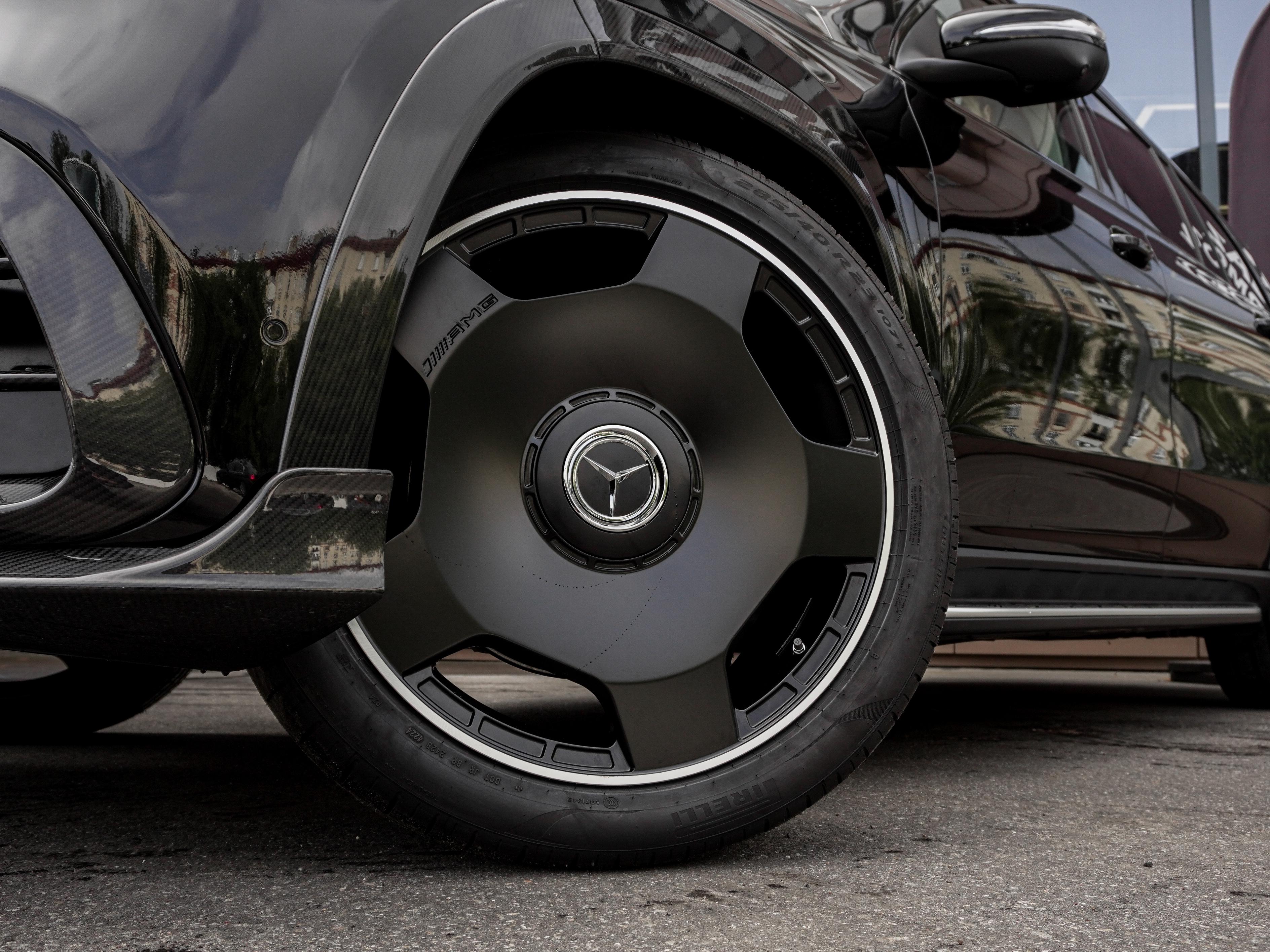 Экстерьер: Кузов в глубоком черном цвете доработан компонентами Brabus, которые добавляют облику GLS строгости и спортивности. Передний спойлер с интегрированной подсветкой, задний диффузор и фирменная решетка радиатора создают узнаваемый силуэт. Массивные кованые диски Brabus Monoblock (дизайн на выбор) идеально заполняют колесные арки, завершая премиальный образ.