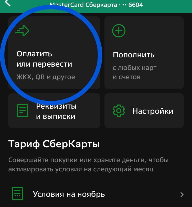 Войдите в приложение Сбербанк Онлайн. Нажмите на раздел "Оплатить или перевести".